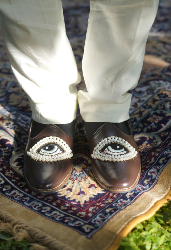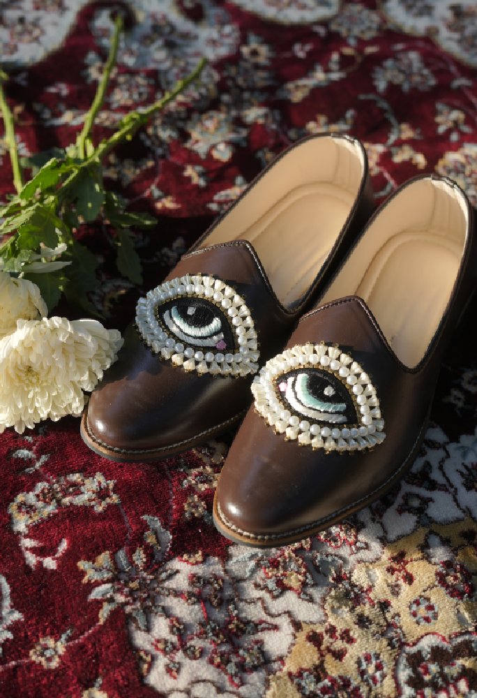 Bold and bright, Nazar – Kāṣhtha captures the power of the watchful eye in a deep, earthy brown. Elevated with fine handwork and delicate pearl details, it is crafted to stand strong with quiet elegance.